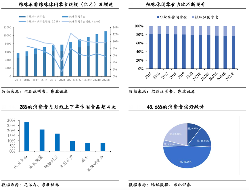 經典案例:根據招股說明書、尼爾森、騰訊數據、東北證券等綜合資訊表明,休閑零食高頻消費特征明顯,弗若斯特沙利文隨機抽取 2200 名消費者調研的結果顯示,81.9%的受訪者每 周至少消費 1 次休閑零食,34.6%的受訪者每周至少消費 2-3 次休閑零食,尼爾森研 究結果顯示,28%的消費者平均每月線上下單休閑食品 4 次以上。辣味成癮性帶動消費需求進一步上升。