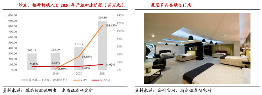 經典案例:根據慕斯招股說明書、公司官網、浙商證券研究所等綜合資訊表明,2017年慕思開始研發、生產、銷售 沙發,最初品牌名為愛慕,同時也引進了意大利品牌卡利亞。2019-2021 年公司其他收入(主要為沙發、按摩椅)從 3.12 億增長至 8.99 億,其中 2021 年增速為 114%、迅速發力,收入占比提升至 14.02%。