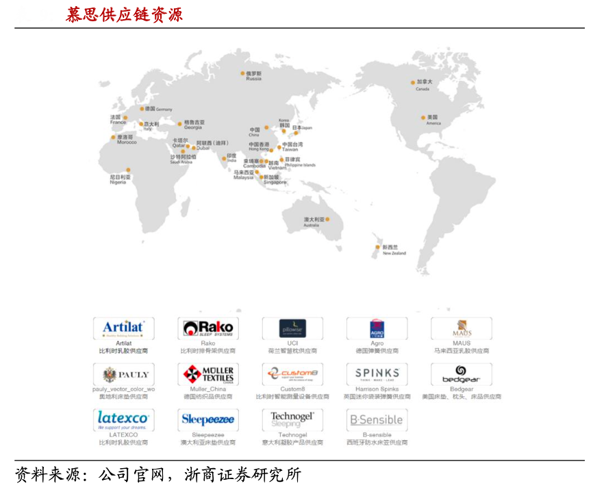 經典案例:根據公司官網、浙商證券研究所等綜合資訊表明,慕思與德國 Agro 彈簧供應商、美國 Bedgear 床墊、枕頭、床品供應 商、意大利 Technogel 凝膠供應商建立穩定的長期合作協議,采購優質原材料,引進世界先進的寢具制造材料和技術,實現產品質量的有力的保障、產品技術的不斷革新與迭代。