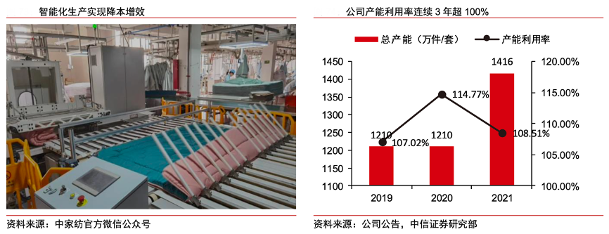 經典案例:根據中家紡官方微信公眾號、公司公告、中信證券研究部等綜合資訊表明,羅萊公司積極發展智能制造,先后引進德國 Mammut 多針絎縫機,西班牙 MASIAS 梳理機,瑞典 KINNA 智能分配、自動折疊設備等;通過機聯網開發,實現繡花機的數字化和網絡化改造;并定制開發智能懸掛系統加強生產工序智能化管理。截至2021 年中,羅萊生產基地擁有自動化設備 2500 余臺,各品類全自動化吊掛(芯類、套件)流水線15條。
