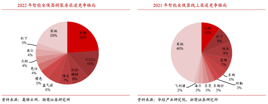 經(jīng)典案例:根據(jù)奧維云網(wǎng)、浙商證券研究所等綜合資訊表明,精裝修衛(wèi)浴市場(chǎng)外資品牌份額67.9% (TOP3為科勒、TOTO、摩恩),內(nèi)資品牌份額為32.1%(TOP3 為九牧、箭牌、歐派),以智能坐便器單品為例,位列前三的科勒/TOTO/杜拉維特市占分別為 23%/15%/9%。同時(shí)以智能坐便器新興線上渠道格局為例,國(guó)貨九牧、恒潔、箭牌位列市占第1、3、4(市占率分別為 10%,9%,7%)。