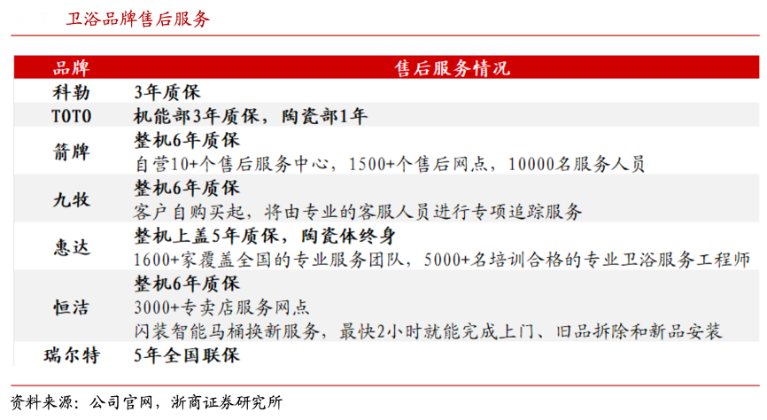 經(jīng)典案例:根據(jù)公司官網(wǎng)、浙商證券研究所等綜合資訊表明,智能衛(wèi)浴產(chǎn)品易損率高,售后服務(wù)是保證用戶體驗(yàn)必不可少的一環(huán)。外資品牌科勒、TOTO 智能坐便器質(zhì)保期均在 3 年,國(guó)產(chǎn)品牌箭牌、九牧、恒潔 6 年整機(jī)質(zhì)保;同時(shí)箭牌配備 1500 家售后網(wǎng)點(diǎn)和上萬名服務(wù)人員,恒潔 3000+專賣店服務(wù)網(wǎng)點(diǎn),可提供上門換新和維修服務(wù)。