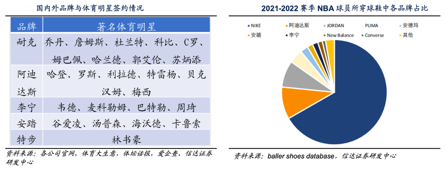 經(jīng)典案例:根據(jù)各公司官網(wǎng)、體育大生意、體壇話報(bào)、愛企查、baller shoes database、信達(dá)證券研發(fā)中心等綜合資訊表明,本土品牌持續(xù)升級(jí)營(yíng)銷資源,李寧、安踏品牌分別在 2012 和 2015 年簽下 NBA 知名球 星德維恩·韋德和全明星后衛(wèi)克萊·湯普森,并推出個(gè)人系列籃球鞋,提升本土運(yùn)動(dòng)品牌在國(guó)內(nèi)外專業(yè)運(yùn)動(dòng)愛好者的影響力。