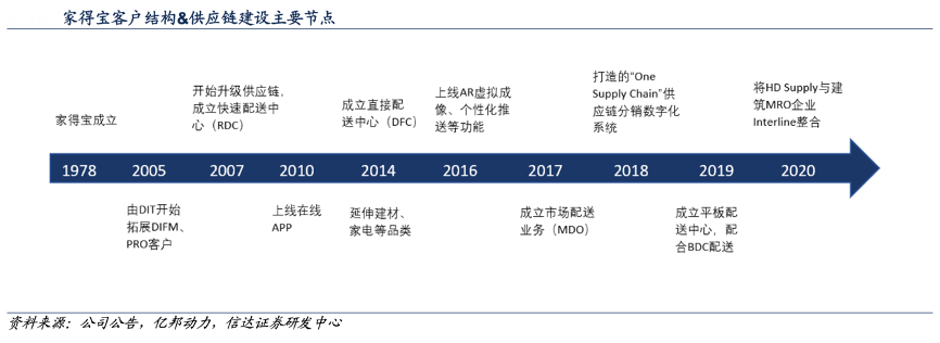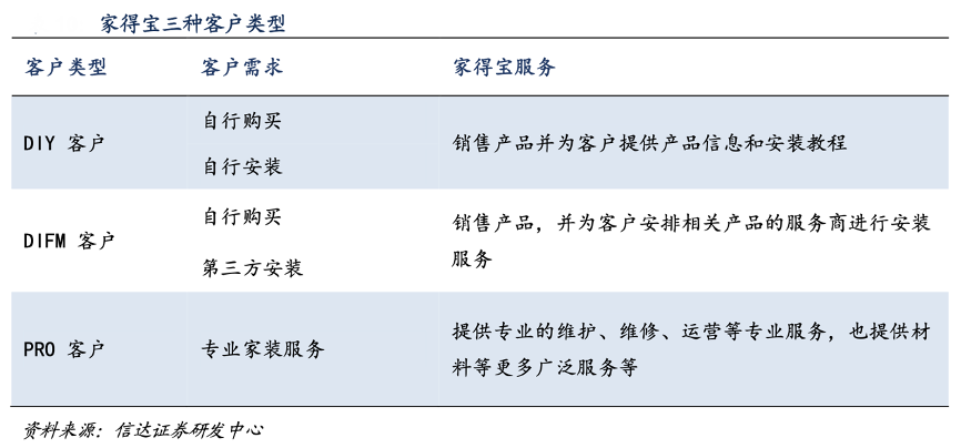 經(jīng)典案例:根據(jù)信達(dá)證券研發(fā)中心等綜合資訊表明,家得寶成立于 1978 年的美國經(jīng)濟(jì)復(fù)蘇時期,其逐步發(fā)展了DIFM(do it for me)客戶小 B 群體、以及 PRO(professional business customer)客戶中大型裝企,使其客戶結(jié)構(gòu)由“C 端 DIY”為主逐步升級為“DIY+DIFM+PRO”的新組合。其中,PRO 為家寶針對建筑工、維修工或者供應(yīng)商提供的服務(wù)。