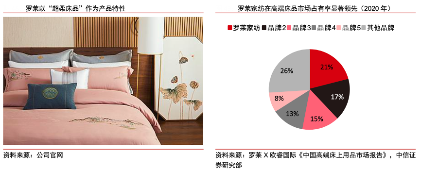 經典案例:根據公司官網、羅萊*歐睿國際《中國高端床上用品市場報告》、中信證券研究部等綜合資訊表明,羅萊的行業龍頭地位穩固,品牌形象深入人心。2019年羅萊品牌總知名度 78.7%、滿意度達到 98.1%,比上年提升 3.8%,品牌具有較高的知名度與美譽度。根據羅萊與歐睿國際聯合發布的《中國高端床上用品市場報告》,2020年中國高端床品市場 CR5 達到 74%,其中羅萊以 21% 的份額穩居行業第一。
