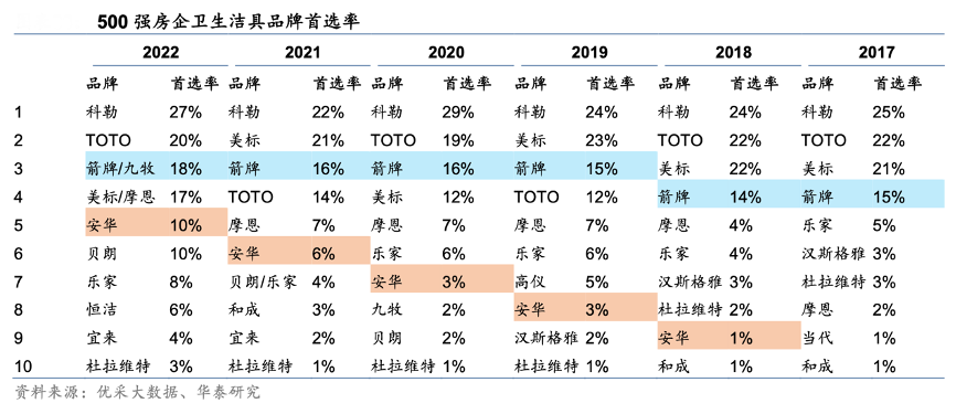 經典案例:根據優采大數據、華泰研究等綜合資訊表明,2017-2019 年箭牌在 500 強 房企衛生潔具中的品牌首選率穩定在15%左右,但首選率排名自 2019 年起上升 1 名并穩定在第三名,同時首選率在 2022 年進一步提升至18%。