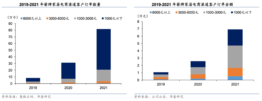 經典案例:根據奧維云網、公司公告、華泰研究等綜合資訊表明,箭牌家居電商渠道的商品主要為衛生陶瓷和龍頭五金,訂單數量最大的價格區間為 1000 元以下,主要由于淋浴花灑、水龍頭、普通坐便器等低價產品易消耗或使用及換新頻率較高;客戶訂單消費金額集中在1000-3000 元區間內,該區間內的產品主要包括智能坐便器、智能恒溫花灑等單價較高的產品及組合。