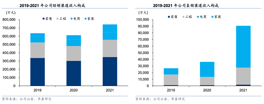 經典案例:根據公司公告、華泰研究等綜合資訊表明,目前箭牌家居的銷售模式為經銷為主,而經銷模式以 C 端零售為主,2022年,公司經銷渠道收入約 66 億元,同比下降11.0%,占總收入 88.0%。同時其打造出覆蓋零售、工程、電商、家裝等全渠道營銷體系,2022年零售/工程/電商/家裝渠道收入占比分別為41.4%/24.6%/20.1%/13.9%。