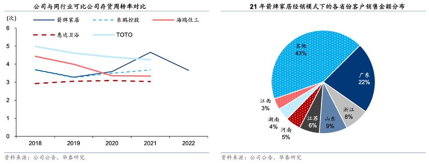 經典案例:根據公司公告、華泰研究等綜合資訊表明,從區域來看,箭牌家居公司經銷收入主要集中在華南廣東省,華東江浙兩省、山東省,以及華中河南省,2019-2021年間,上述五省經銷收入分別占總經銷收入46.37%、50.46%和 49.79%。 這五省的經銷商數量也最多,主要原因是這五省經濟較好,2021 年,上述五省也是國內省份GDP 產值最高的 TOP5。