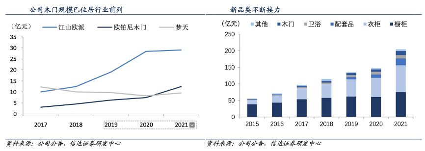 經(jīng)典案例:根據(jù)公司公告、信達證券研發(fā)中心等綜合資訊表明,歐派家居公司已由單一櫥柜龍頭逐步發(fā)展成為櫥、衣兩大核心品類并進,同時配套品、木門、衛(wèi)浴、金屬門窗等多品類布局; 零售客單值明顯提升,打造大家居品牌平臺優(yōu)勢。此外,木門、衛(wèi)浴、其他(含金屬門窗、裝甲門、軟裝、墻飾、優(yōu)材等)收入占比也呈穩(wěn)步提升趨勢。2021年,公司木門業(yè)務實現(xiàn)收入 12.4 億元,收入占比 6%,營收規(guī)模已位居木門行業(yè)前列。