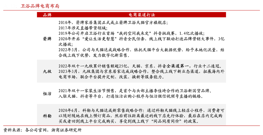 經(jīng)典案例:根據(jù)各公司官網(wǎng)、浙商證券研究所等綜合資訊表明,箭牌早在 2010 年 成立天貓旗艦店,2017 年涉足直播帶貨,2019 年開啟衛(wèi)浴行業(yè)首場抖音挑戰(zhàn)賽,目前天貓/京東/抖音粉絲數(shù)為 150/458/34 萬,電商由經(jīng)銷商專營,配備專門的電商產(chǎn)品研發(fā)中心,線上專供產(chǎn)品占 80-90%。而九牧在三個(gè)平臺(tái)粉絲數(shù)都是最多的,且與第二名有翻倍身位差 距,目前天貓/京東/抖音粉絲數(shù)為 283/851/64 萬,線上專供產(chǎn)品占80%。