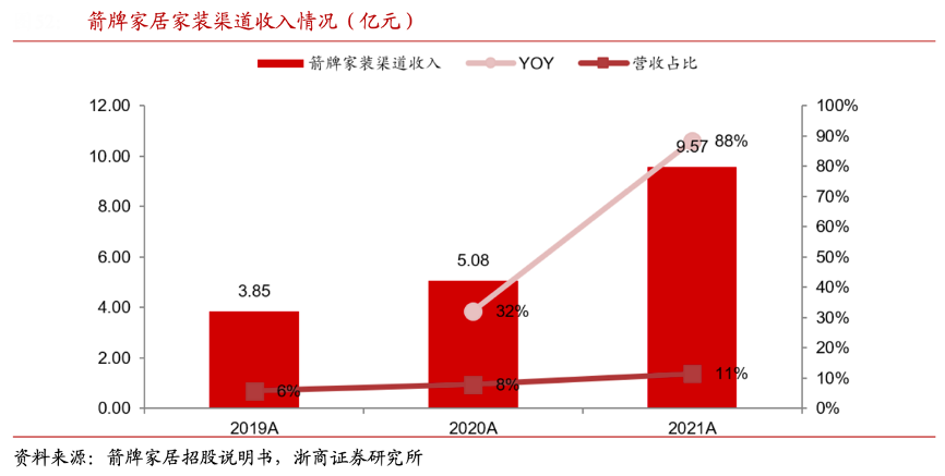 經(jīng)典案例:根據(jù)箭牌家居招股說明書、浙商證券研究所等綜合資訊表明,家裝店提供一站式解決方案,受消費(fèi)者青睞,各品牌與頭部裝企合作,采取開設(shè)家裝公司店中店模式,獲取家裝渠道流量。箭牌家居2021年家裝收入9.6 億元(+88.43%),12000個(gè)線下網(wǎng)點(diǎn)中有近 3000 家家裝店,家裝店是未來開店重心。