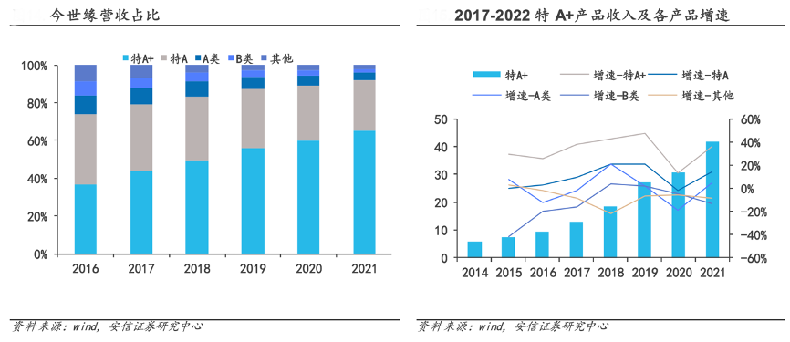 經(jīng)典案例:根據(jù)wind、安信證券研究中心等綜合資訊表明,今世緣公司有國緣、今世緣、高溝三大白酒品牌,分別定位于高端與次高端、中端、低端。公司產(chǎn)品結(jié)構(gòu)持續(xù)優(yōu)化,中高端以上產(chǎn)品表現(xiàn)亮眼,2022 年 公司特 A+類產(chǎn)品實(shí)現(xiàn)營業(yè)收入 51.97 億元(+24.78%),營收占比由 2016 年的 36.82%提升 至 65.92%,主要由國緣 V 系、開系拉動(dòng)。