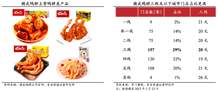 經典案例:根據精武鴨脖公司官網、窄門餐眼、東亞前海證券研究所等綜合資訊表明,精武鴨脖成立于 1991 年,主要經營休閑鴨脖類產品,截至 2023 年 3 月 23 日,其在全國范圍內已有 548 家門店,覆蓋了全國 30 個省份和 189 個城市。精武鴨脖在三線及以下城市門店占比更高,其中湖州、武漢和杭州為門店數量最多的城市。
