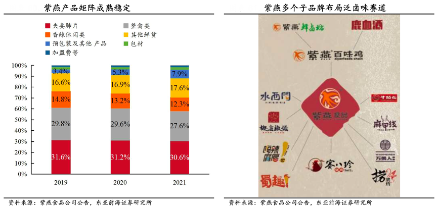 經典案例:根據紫燕食品公司公告、東亞前海證券研究所等綜合資訊表明,紫燕營業收入主要來自于夫妻肺片、整禽類、香辣休閑類、其他鮮貨等鮮貨產品。其中夫妻肺片、以紫燕百味雞為代表的整禽類產品 2021 年營收占比分 別為 30.6%/27.6%,同比-0.6pct/-2pct,近年占比總體穩定。深耕佐餐 鹵味的同時,紫燕食品在泛鹵味方面亦進行布局,其中包括紫燕鮮鹵坊、 椒言椒語等鮮鹵品牌,麻甲線、萬美人等休閑鹵味,以及賽八珍貢鵝、嗨辣麻唇等鹵味餐飲。
