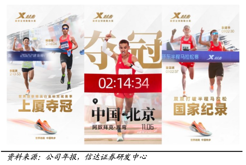 經典案例:根據公司年報、信達證券研發中心等綜合資訊表明,在 2022 年北 京馬拉松賽場上,特步 160X 3.0 PRO 助力阿奴拜克·庫彎拿下職業生涯最具含金量 的冠軍。同年,穿著特步 160X 3.0 PRO 的運動員彭建華、董國建在廈門環東半程馬拉松賽上,分別以 1 小時 02 分 30 秒、1 小時 02 分 37 秒的成績,雙破塵封 13 年之久的半程馬拉松國家紀錄。特步簽約運動員路穎穿著 160X 3.0 PRO 以 1 小時 12 分 09 秒的成績,問鼎女子半馬賽道冠軍。