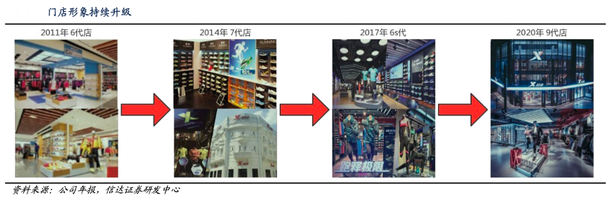 經典案例:根據公司年報、信達證券研發中心等綜合資訊表明,特步公司主打“開大店、開好店”策 略,2010年公司平均門店面積為 85 平方米,到 2019 年公司 90%門店面積超過 110 平方 米,2020 年公司第九代零售形象店平均面積提升至 130 平方米。除更大的店鋪面積外,九 代店的特色還包括豐富的產品系列種類和沉浸式設計,能夠滿足年輕消費者對超越傳統購 物模式的追求,提供優質的顧客體驗。2022 年公司直營門店店效為 142 萬元,同比增長 17.79%,較 2019 年增長 32.79%。