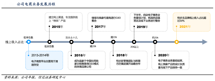 經典案例:根據公司年報、信達證券研發中心等綜合資訊表明,特步公司在疫情期間迅速將市場推廣、 銷售資源轉移至社交媒體平臺,并充分利用直播電商以提高線上曝光度,推動線上銷售實 現快速增長,2021 年特步主品牌線上收入占比超 30%。