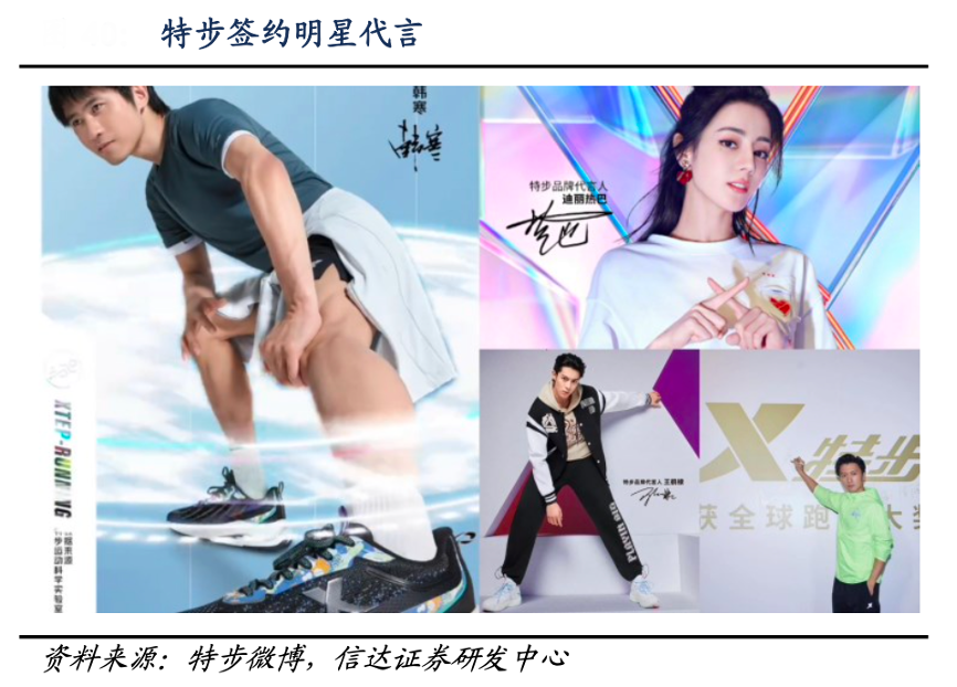 經(jīng)典案例:根據(jù)特步微博、信達證券研發(fā)中心等綜合資訊表明,特步公司通過簽約明星以持續(xù)傳播品牌知名度,簽約明星包括王鶴棣、迪麗熱巴、范丞丞、謝霆鋒、韓寒等。2021年特步攜迪麗熱巴推出首個女子系列“半糖”,激勵女性自信地展示真實自我,宣示獨特的自我主張,為品牌轉(zhuǎn)型升級創(chuàng)造長期勢能。公司還以“特步特不服”為題贊助《中國新說唱》、《這就是街舞》和《明日之子》等節(jié)目,擺脫刻板印象,邁向品牌年輕化、潮流化。