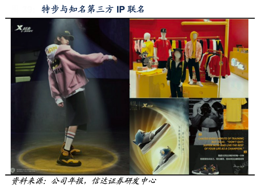 經(jīng)典案例:根據(jù)公司年報、信達證券研發(fā)中心等綜合資訊表明,特步公司注重娛樂營銷推廣,采用聯(lián)名方式打通和拓寬受眾群體。2020年公司與中國內(nèi)地最賣座的動畫電影之一《姜子牙:一戰(zhàn)封神》合作,以電影角色神話人物為主要設計靈感,推出跨界系列產(chǎn)品,將中國傳統(tǒng)文化融入現(xiàn)代時尚運動服裝中,在各類社交媒體平臺上不斷創(chuàng)造出熱門話題,深受年輕人喜愛。