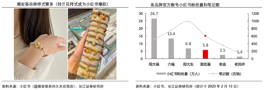 經典案例:根據小紅書、小紅書(@潮宏基蘇州久光百貨店)、長江證券研究所等綜合資訊表明,潮宏基從年輕時尚的差異化品牌定位和設計精湛、推新速度快的優勢能力出發,推出樣式繁多的輕巧串珠,相較于其他品牌多數產品在設計風格和克重上偏厚重的款式,更容易贏得年輕消費者的青睞,通過小紅書等 社交平臺上的種草傳播,串珠系列迅速成為網紅產品,形成了初具規模的粉絲基礎。