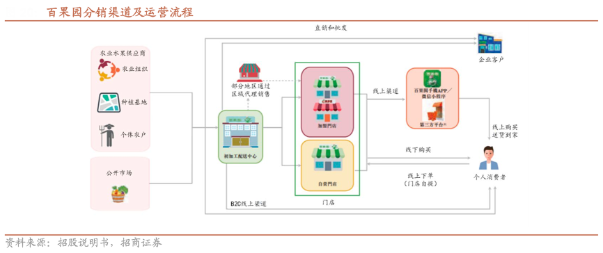 經(jīng)典案例:根據(jù)招股說明書、招商證券等綜合資訊表明,零售渠道端,百果園公司建立了線上線下一體化及倉店一體化的水果專營加盟模式,實現(xiàn)“線上做寬、線下做專”。其采用的“線上線下一體化運營模式”在水果專營零售行業(yè)具有較強(qiáng)的競爭優(yōu)勢,其采用倉店一體化的模式,使線上下單的消費者可以選擇在指定門店提貨或即時/次日送貨上門,進(jìn)而增強(qiáng)用戶體驗同時改善運營效 率降本,旨在通過“線上做寬、線下做專”實現(xiàn)全渠道觸達(dá)的同時滿足消費者多快好省的需求。
