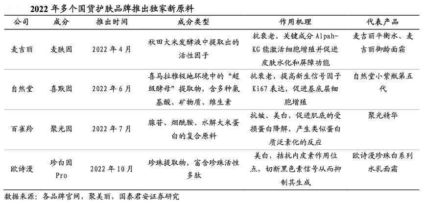 經典案例:根據各品牌官網、聚美麗、國泰君安證券研究等綜合資訊表明,原料、成分開發成為新熱點,品牌商紛紛推出獨家成分。2022 年多個美妝品牌推出“獨家成分”,如自然堂推出“喜默因”、麥吉麗推出“麥膚因”、百雀羚推出“聚光因”、歐詩漫推出“珍白因”,均希望復刻“玻色因”對歐萊雅集團的影響力。