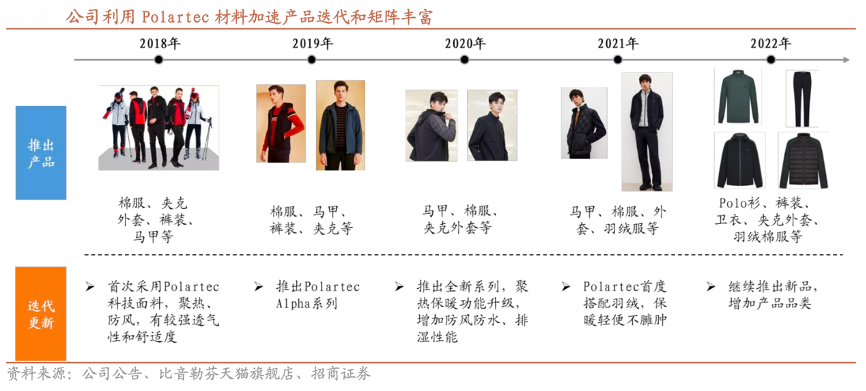 經(jīng)典案例:根據(jù)公司公告、比音勒芬天貓旗艦店、招商證券等綜合資訊表明,比音勒芬公司持續(xù)進行功能性產(chǎn)品的升級迭代,致力于提高消費者穿著舒適度、便捷性,實現(xiàn) 防風(fēng)、防水、防曬、抗菌、保暖等多重功能,打造出更高品質(zhì)的服裝。公司自 2018 年起采用美國 Malden Mills 研制的 Polartec 抓絨面料,近五年每年均推出全新產(chǎn)品,覆蓋品類逐步豐富、功能屬性不斷拓展,贏得消費者的信賴和口碑。