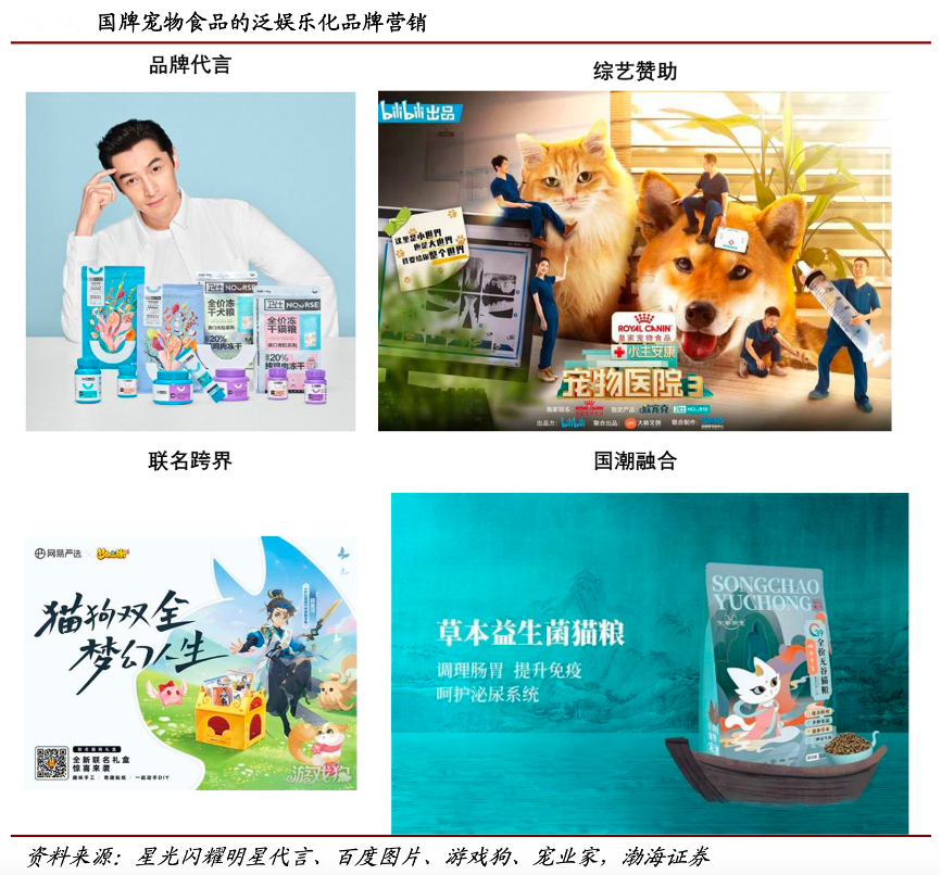 經典案例:根據觀研天下、魔鏡數據、渤海證券等綜合資訊表明,2019 年,國內線上寵物食品品牌為 1.4 萬個,至 2021 年增加到 3.7 萬個,其中 大量品牌通過自創 IP 形象、請明星和大 V 代言等形式獲得年輕寵物主的關注,并通過電商渠道轉化為實際購買力。天貓淘寶平臺 2022 滾動年(2021 年 8 月 -2022 年 7 月)TOP 10 貓糧品牌中,國產品牌與外資品牌銷售額差距并不大, 外資品牌僅領先 2.7 億元銷售額,且期間內國產品牌銷售額的平均增速為 151.43%,顯著高于外資品牌。