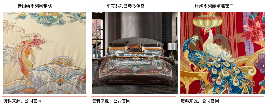 經(jīng)典案例:根據(jù)公司官網(wǎng)、中信證券研究部等綜合資訊表明,富安娜將四大名繡(湘繡,蜀繡,潮繡,蘇繡) 與現(xiàn)代設計結(jié)合,打造新國繡系列新品,如風雅頌款以中式圖案為基本元素結(jié)合時下流行的煙灰色、水藍色、琉璃黃,打造沉穩(wěn)內(nèi)斂的中式美學寢居。印花系列的巴赫馬爾宮采用真絲大提花設計,獨服平網(wǎng)印花,舒適親膚,畫面主題突出。婚嫁系列的囍結(jié)連理以珠寶 孔雀為主要元素,周邊飾以歐式噴泉和并蒂鳶尾花,蘊含美好寓意,設計精美大氣。