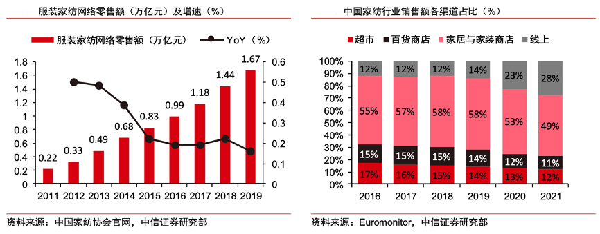 經(jīng)典案例:根據(jù)中國家紡協(xié)會官網(wǎng)、Euromonitor、中信證券研究部等綜合資訊表明,2020-2021年中國家紡行業(yè)線上銷售額占比分別為 22.5%、27.7%,相比上年分別提高 8.5、5.2pcts,已成為第二大銷售渠道;家居與家裝專賣店仍為第一大銷售渠道,占比 49.0%。