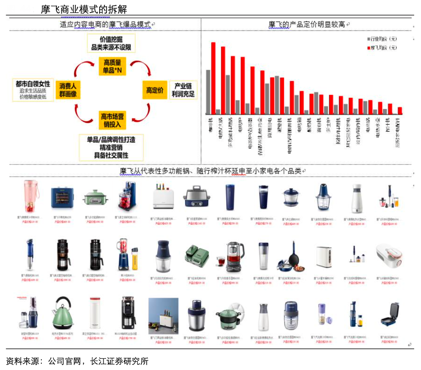 經(jīng)典案例:根據(jù)公司官網(wǎng)、長(zhǎng)江證券研究所等綜合資訊表明,摩飛的爆品模式可以拆解為:1)精準(zhǔn) SKU 投放背景下產(chǎn)品以大單品、 少 SKU 的形式開展;2)內(nèi)容電商可以實(shí)現(xiàn)對(duì)消費(fèi)人群的細(xì)分,摩飛對(duì)品牌形象進(jìn)行了人群的精準(zhǔn)定位;3)內(nèi)容電商對(duì)費(fèi)用投放的較高要求,摩飛將人群限定在“相對(duì)高消 費(fèi)、追求品質(zhì)生活的女性人群”且產(chǎn)品采用高定價(jià);4)成長(zhǎng)空間上,只要符合人群消費(fèi) 定位的小家電產(chǎn)品均可以延申,摩飛品牌的產(chǎn)品來源基本不受限。