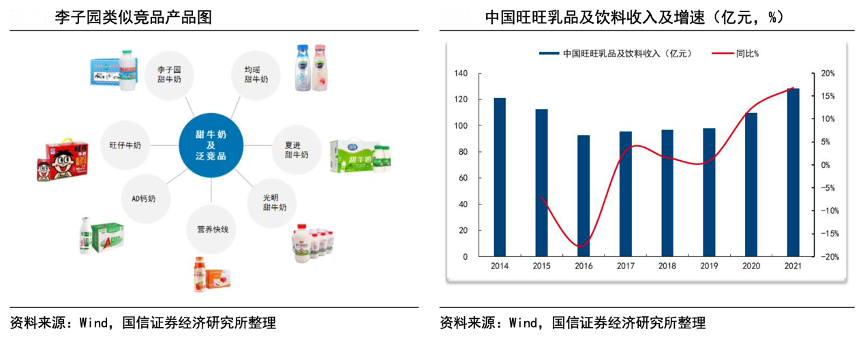 經典案例:根據wind、國信證券經濟研究所等綜合資訊表明,目前市場上與李子園甜牛奶形成競品關系的產品極少,從以上全國性競品銷售體量來看,AD 鈣奶于 2009 年銷售額就已超 過 30 億人民幣,目前已是百億單品;營養快線于 2013 年銷售額突破 200 億人民幣;旺仔牛奶銷售額超過 100 億,營養快線與旺仔牛奶單品體量均破百億。