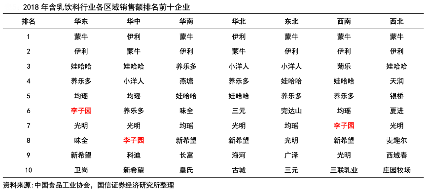 經典案例:根據中國食品工業協會、國信證券經濟研究所等綜合資訊表明,2013-2018 年含乳飲料市場中華東地區一直占領區域銷售額的榜首區域,約占全國市場的30%左右。華北和華區含乳飲料銷售額緊隨其后,占比保持相對穩定約為 15%。目前李子園憑借 “甜牛奶”產品與頭部乳企的“酸牛奶”產品形成差異化競爭,在含乳飲料行業中市場占有率排名第 7,并且在華東、華中及西南等市場銷售額均躋身前十。