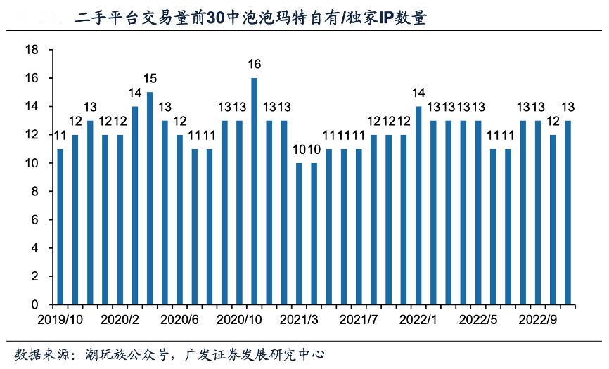 經(jīng)典案例:根據(jù)潮玩族公眾號(hào)、廣發(fā)證券發(fā)展研究中心等綜合資訊表明,二手平臺(tái)交易量排名前30的產(chǎn)品中,2022年泡泡瑪特自有/獨(dú)有IP數(shù)量整體高于 2021年,新IP孵化成果良好。2022年二手平臺(tái)交易前30的產(chǎn)品中泡泡瑪特自有/獨(dú)家 IP數(shù)量達(dá)到月均12.2款,高于2021年的11.4款,新IP貢獻(xiàn)增量明顯,如2022年7月推出的HACIPUPU,“普通又有點(diǎn)特別的小男孩”形象深深抓住了大眾渴望保持童心的心理。