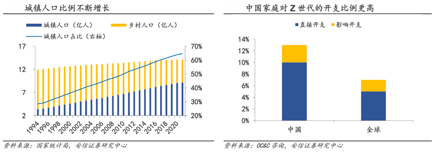 經(jīng)典案例:根據(jù)國(guó)家統(tǒng)計(jì)局、OC&C咨詢(xún)、安信證券研究中心等綜合資訊表明,Z 世代所代表的 1995-2009 年 是我國(guó)經(jīng)濟(jì)騰飛及人民生活水平大幅提升的主要階段,其在城鎮(zhèn)出生長(zhǎng)大的比例高,家庭環(huán)境總體而言較為殷實(shí),家庭支出中更愿意為在 Z 世代上消費(fèi)。根據(jù) OC&C 的咨詢(xún)報(bào)告,中國(guó)家庭 13%的開(kāi)支投入在了 Z 世代,高于全球 7%的平均水平。