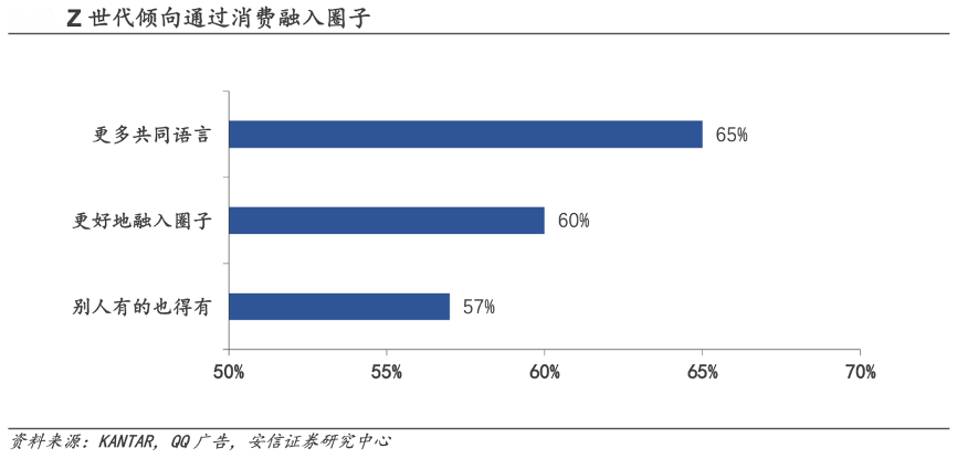 經(jīng)典案例:根據(jù)KANTAR、QQ廣告、安信證券研究中心等綜合資訊表明,從成長(zhǎng)背景上看,Z 世代多為獨(dú)生子女,從小就需要通過(guò)社交和興趣愛(ài)好的展示來(lái)吸引志同道合的朋友,根據(jù)《Z 世代消費(fèi)力白皮書(shū)》的調(diào)查,60%的 Z 世代受訪(fǎng)者希望別人可以更好地融入自己的圈子,57%的受訪(fǎng)者認(rèn)為別人有的自己也得有,不想被嫌棄。