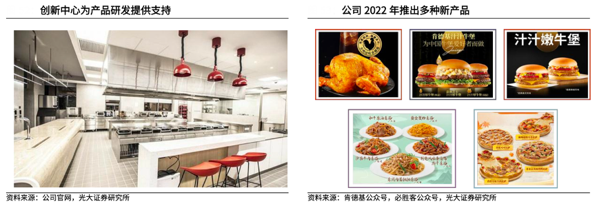 經典案例:根據公司官網、肯德基公眾號、必勝客公眾號、光大證券研究所等綜合資訊表明, 2019年3月,肯德基公司位于上海的創新中心正式投入使用,該中心為一體化研發中心,配備世界頂級設備,包括測試廚房、感官測試區域以及一整套實驗室,涵蓋品質管理、設備與餐廳技術應用測試以及內容制作等諸多領域,為新產品研發和加強餐廳現代化管理提供支持。2022年,公司共推出 500 余款新產品及改良產品,其中不乏全新上市的“秘汁全雞”等現象級爆款產品,持續提升品牌吸引力。