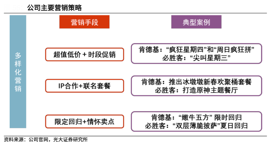 經(jīng)典案例:根據(jù)公司官網(wǎng)、光大證券研究所等綜合資訊表明,百勝中國公司以“超值促銷+IP 聯(lián)名”掌握流量密碼,“限時回歸”主打情懷營銷。其除了邀請明星廣告代言增加品牌曝光度外,公司也精心策劃出多個“出圈”的營銷活動,不斷強化品牌賣點。從火遍全網(wǎng)的“瘋狂星期四”段子,到必勝客原神主題餐廳,再到限時回歸經(jīng)典產(chǎn)品“嫩牛五方”,公司利用低價促銷、 IP 聯(lián)名和限定回歸等多樣手段進行品牌營銷,打造品牌記憶點。