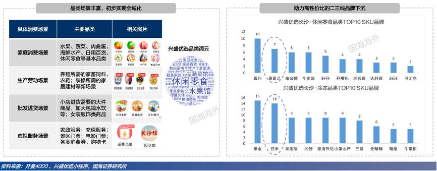 經(jīng)典案例:根據(jù)開(kāi)曼4000、興盛優(yōu)選小程序、國(guó)海證券研究所等綜合資訊表明,興盛優(yōu)選在湖南深耕多年,率先在品類上打破家庭消費(fèi)場(chǎng)景,實(shí)現(xiàn)全域化覆蓋,自然延伸到生產(chǎn)、批發(fā)等場(chǎng)景,比如售賣生產(chǎn)所需的飼料、批發(fā)所需的大件商品(大筐雞蛋等)、虛擬服務(wù)商品(景區(qū)電影票、各類消費(fèi)券等)、裝修所需的家居建材等,深度匹配下沉區(qū)域用戶需求,提高平臺(tái)用戶粘性。