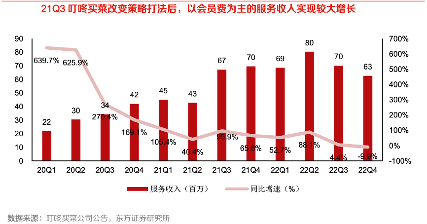 經(jīng)典案例:根據(jù)叮咚買菜公司公告、東方證券研究所等綜合資訊表明,21Q3 叮咚買菜改變策略打法后 積極推廣會(huì)員制度,提高用戶粘性,21Q3 服務(wù)收入實(shí)現(xiàn)階梯式增長,同比增長 95.9%,環(huán)比增 長 57.1%。22Q3,盡管服務(wù)收入增長放緩,綠卡會(huì)員對(duì)收入的貢獻(xiàn)依舊顯著。