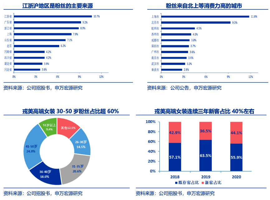 經典案例:根據公司招股書、公司公告、申萬宏源研究等綜合資訊表明,截至 2020 年 12 月 31 日戎美高端女裝粉絲各年齡段均有分布,其中 30-50 歲“輕熟”、“知性”女性占比超 60%。粉絲主要分布于華東、華北和華南等消費人口較多、經濟較為發達地區。江浙滬三地占比超過 25%,按城市劃分,上海是最大的粉絲來源地,粉絲占比超 10%。
