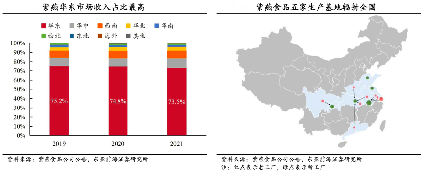 經(jīng)典案例:根據(jù)紫燕食品公司公告、東亞前海證券研究所等綜合資訊表明,目前紫燕的主要市場(chǎng)仍在華東地區(qū),2021 年收入占比約 73.51%,同時(shí)其已經(jīng)形成了以寧國(guó)、武漢、連云港、山東、重 慶等 5 家工廠(chǎng)輻射全國(guó)的產(chǎn)能布局,實(shí)現(xiàn)前一天下單、當(dāng)天生產(chǎn)、當(dāng)日或 次日配送到店,保證了產(chǎn)品的新鮮度,為紫燕在不同區(qū)域銷(xiāo)售規(guī)模的擴(kuò)張?zhí)峁┯辛?yīng)鏈保障。