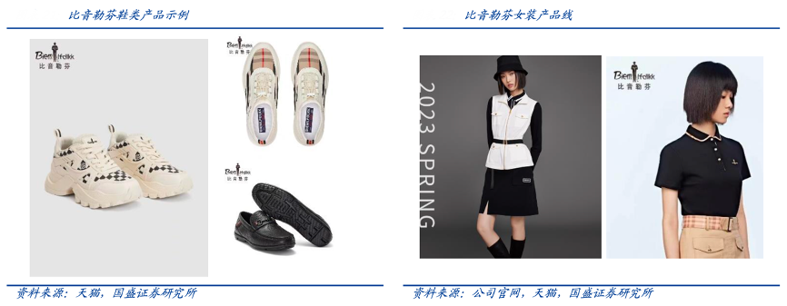 經典案例:根據公司官網、天貓、國盛證券研究所等綜合資訊表明,比音勒芬針對核心客群的消費習慣,拓展并豐富鞋類品類,針對客群消費習慣,公司推出鞋類產品并與服裝成套搭配售賣,為消費者提供一站式、全面的服飾消費 選擇方案。例如打造 X-STATIC 銀纖維抗菌防臭科技鞋履,兼具舒適性與搭配實穿性。同時拓展女性消費人群,推出相似調性和風格的女裝產品,有效實現客群的拓展。