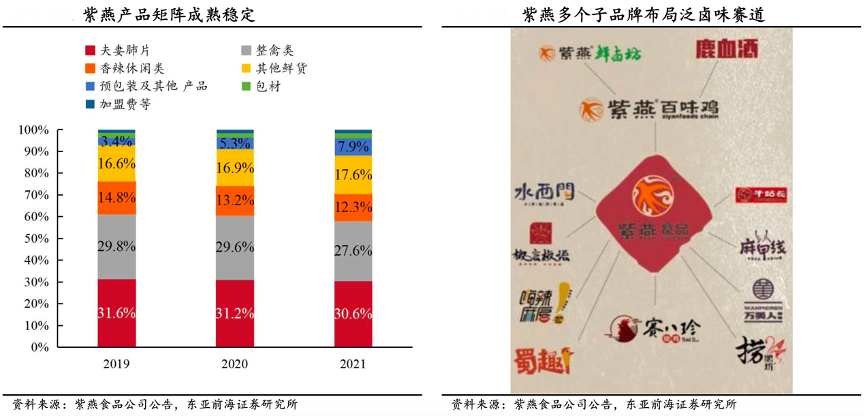 經典案例:根據紫燕食品公司公告、東亞前海證券研究所等綜合資訊表明,紫燕營業收入主要來自于夫妻肺片、整禽類、香辣休閑類、其他鮮貨等鮮貨產品。其中夫妻肺片、以紫燕百味雞為代表的整禽類產品 2021 年營收占比分 別為 30.6%/27.6%,同比-0.6pct/-2pct,泛鹵味包括紫燕鮮鹵坊、 椒言椒語等鮮鹵品牌,麻甲線、萬美人等休閑鹵味,以及賽八珍貢鵝、嗨辣麻唇等鹵味餐飲。