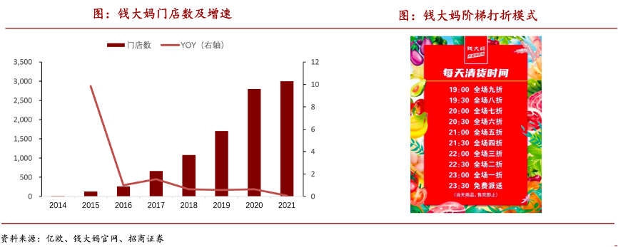 錢大媽以“不賣隔夜肉”為經(jīng)營(yíng)理念,契合老年人對(duì)新鮮生鮮食品的需求。錢大媽采用定時(shí)打折清貨模式,每天19:00開始自動(dòng)打折促銷,每隔半小時(shí)再低一折,23:30后免費(fèi)配送。