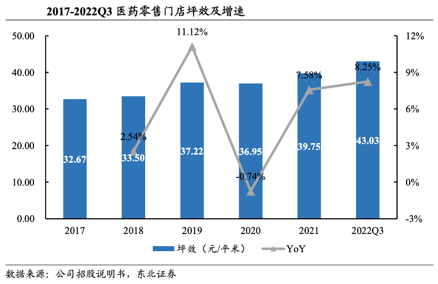 經典案例:根據公司招股說明書、東北證券等綜合資訊表明,健之佳公司選擇有競爭優勢的地段,構建時尚人性化的環境,并針對店鋪所在地區選取適合產品,力求“千店千面”,實現門店跨區域快速擴張與店效提升。2017-2021 年公司醫藥零售藥店坪效分別為 32.67 元/平方米、33.50 元/平方米、37.22 元/平方米、36.95 元/平方米、39.57 元/平方米, 最終提升至 2022 年 Q3 的 43.03 元/平方米,2021 年同比增長 7.58%,2022Q3 增長 8.25%,增長效率持續提升。