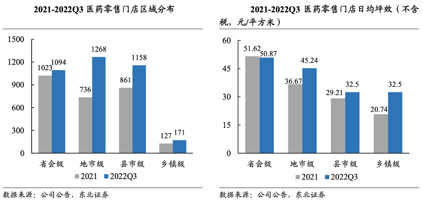 經典案例:根據公司公告、東北證券等綜合資訊表明,2022 年,健之佳公司重點加強地級、縣級城市滲透力度,新增 門店主要分布于下沉市場,公司由省會城市向地、縣級城市滲透的門店布局已形成 一定規模,區域門店密度進一步提升。截至 2022Q3 末,省會級公司醫藥零售門店 數為 1,094 家,占比 29.64%,地市級門店數為1,268 家,占比 34.35%。同時,門店日均 坪效提升,尤其是鄉鎮級別門店坪效從 2021 年從 20.74 元/平方米提高到 2022Q3 的 32.5 元/平方米,提高幅度達 56.7%,下沉市場門店效率提升明顯。