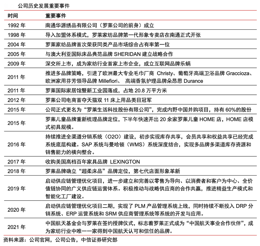 經典案例:根據公司官網、公司公告和中信證券研究部等綜合資訊表明,羅萊公司 1998 年在業內率先推出加盟體系模式,2004 年首次登頂同類產品市場占有率第一位并保持至今。公司持續推進多品牌戰略,2021 年公司進一步加強定位“羅萊超柔床品”,并簽約成為“中國航天事業合作伙伴”, 成為家紡行業中唯一一家得到中國航天認可和信任的品牌。