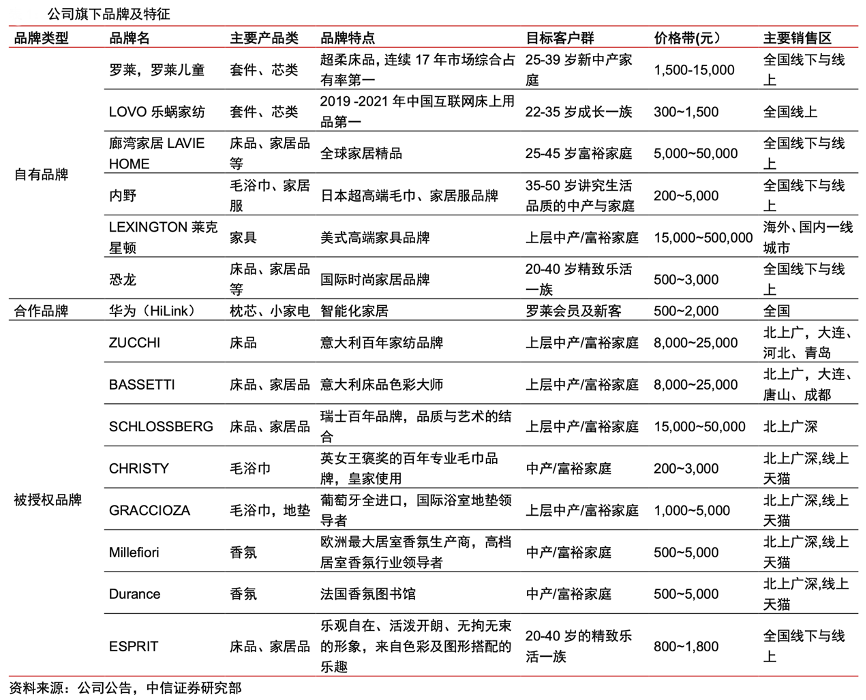 經典案例:根據公司公告、中信證券研究部等綜合資訊表明,羅萊公司成立于 1992 年,主要業務為以床上用品為主的家用紡織品的研發、設計、生產、以及銷售,主要產品包括寢具、芯類、生活家居 品等。公司通過打造自有品牌、聯合合作品牌、以及簽約代理品牌,實現了市場的錯位布 局,目標客戶群體廣泛。其中羅萊、羅萊兒童主品牌主打中高端消費。